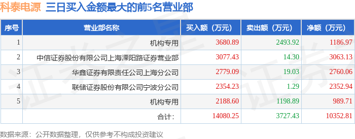 证券之星消息明日股票走势?,沪深交易所2024年12月19日公布的交易公开信息显示,科泰电源(300153)因日涨幅达到15%的前5只证券,连续三个交易日内,涨幅偏离值累计达到30%的证券登上龙虎榜。此次是近5个交易日内第1次上榜。