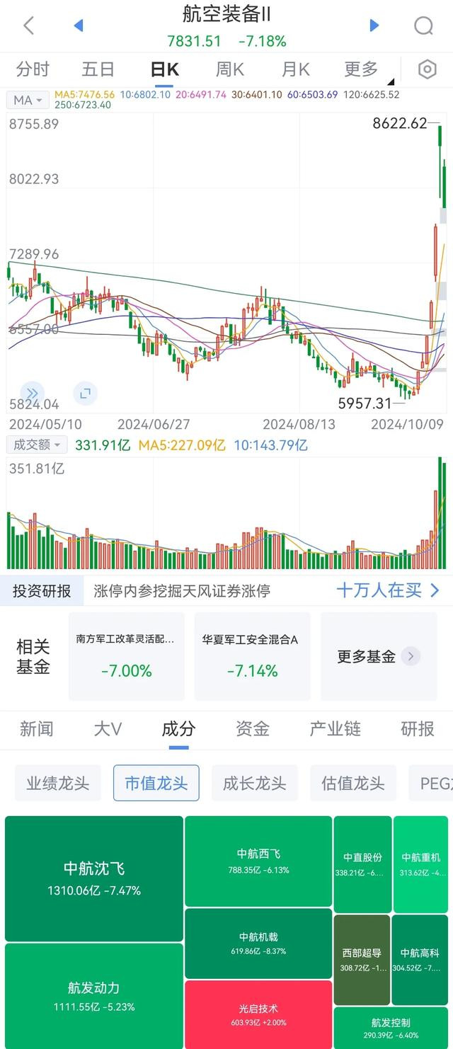 航空装备板块,主力资金连续2天净卖出,近24个交易日8天净买入,结束连续6天上涨昨日挑战前期8654点小台阶未果,日内放量大跌但未补齐第一个缺口,所有均线均未跌破,均线间没有距离,120日及以下均线已拐头向上。
